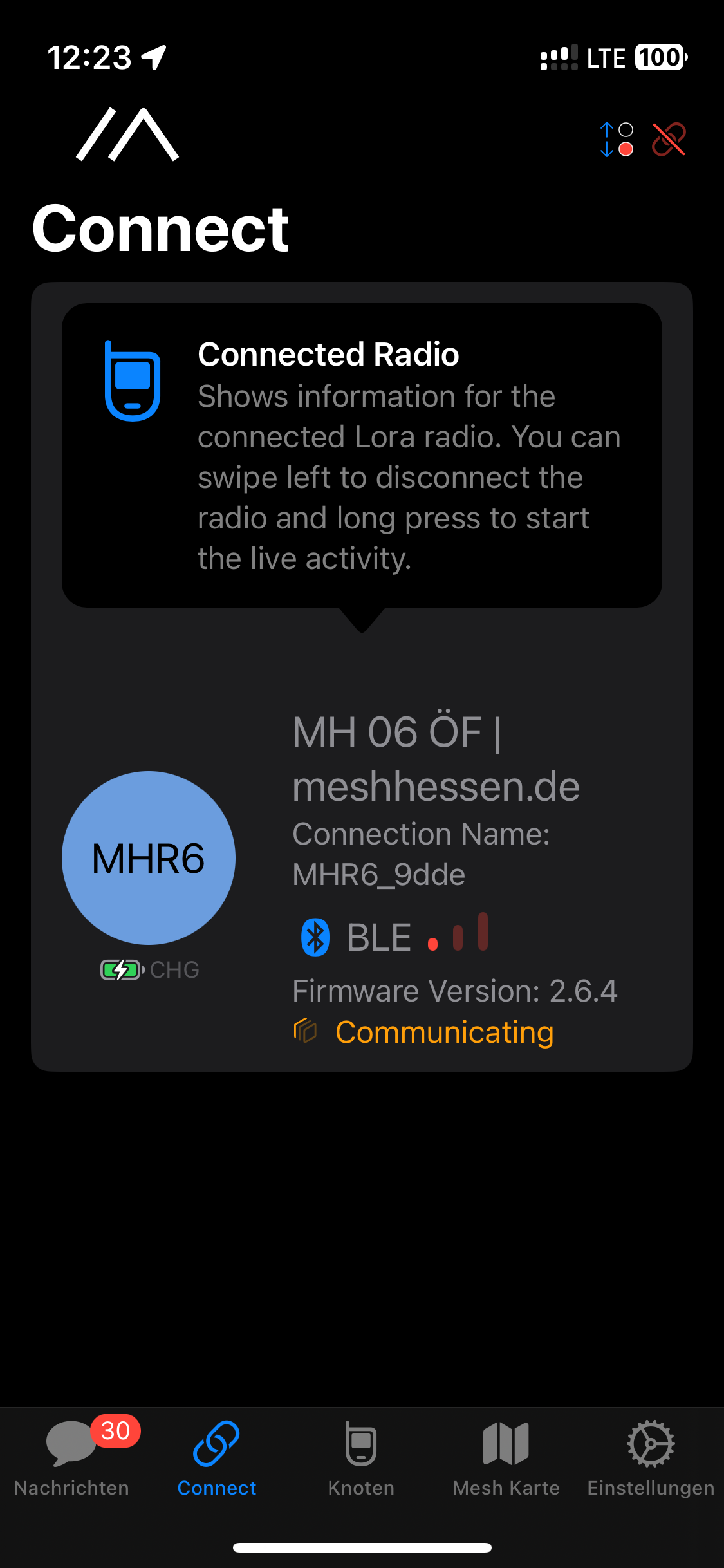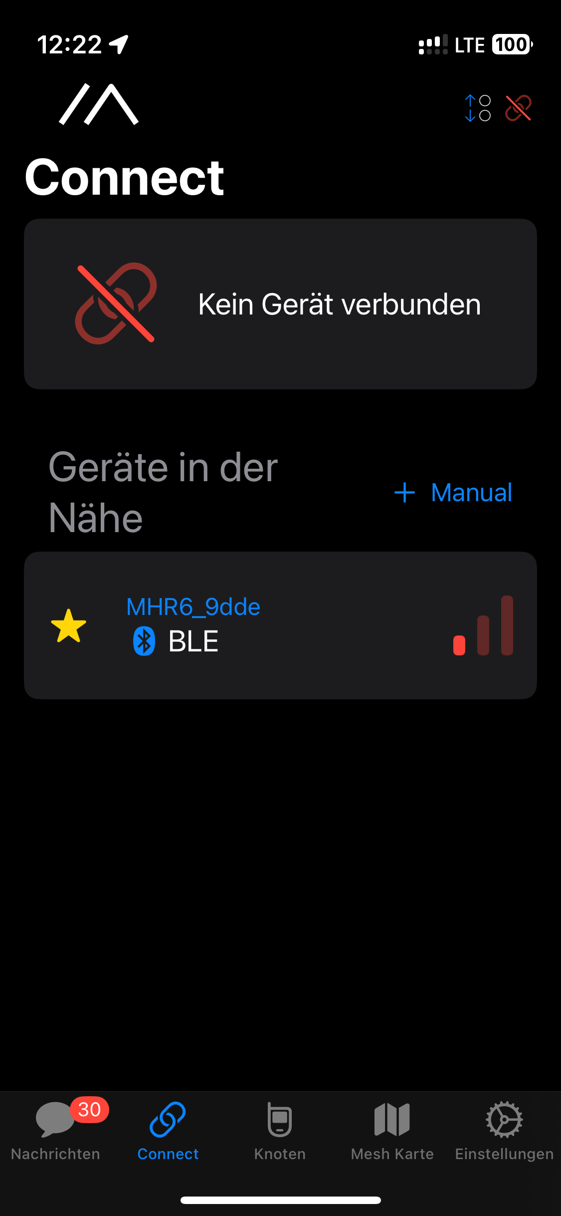 Nach dem Sie die App installiert und gestartet haben, können Sie sich unten im Reiter „Connect“ die über Bluetooth koppelbare Meshtastic Node „MHR6_9dde“ anzeigen lassen und sie anwählen.