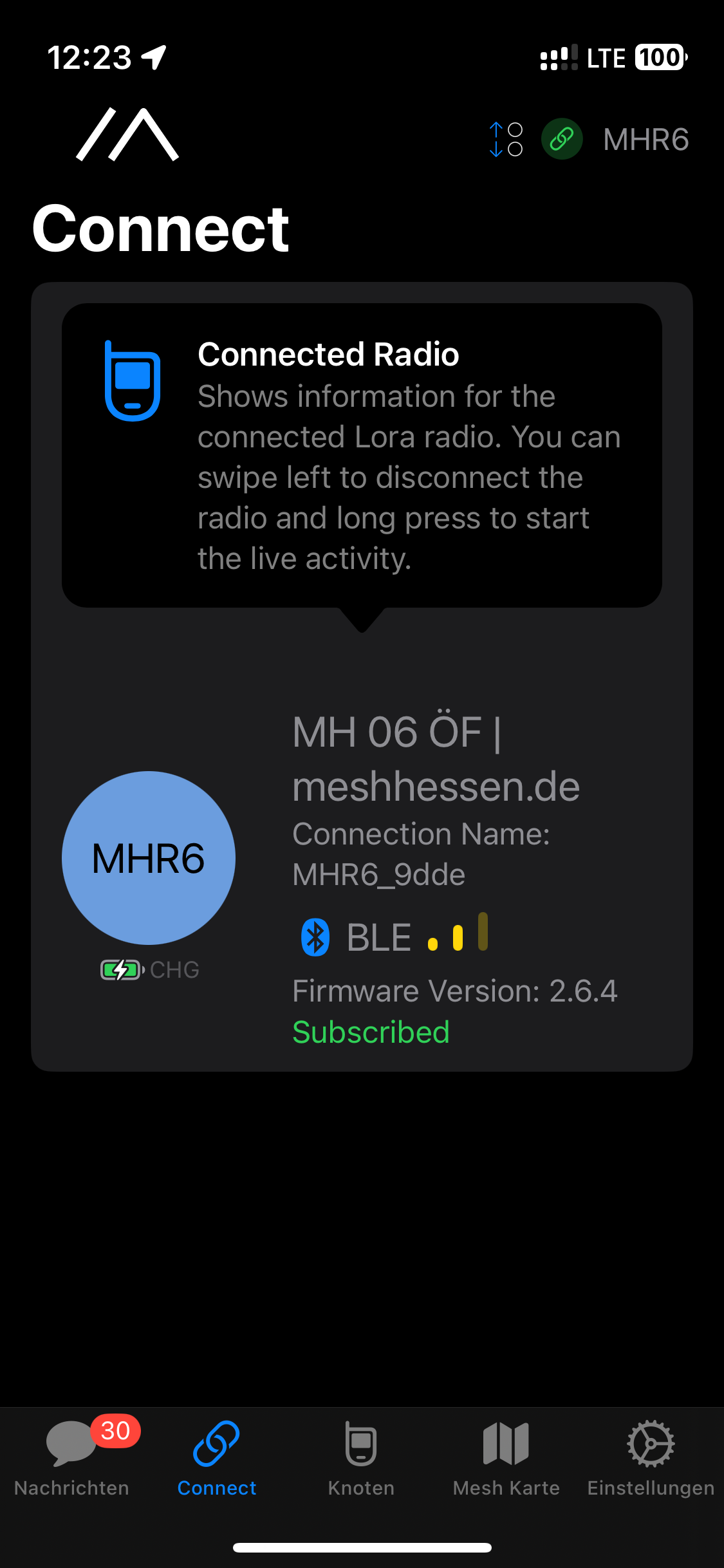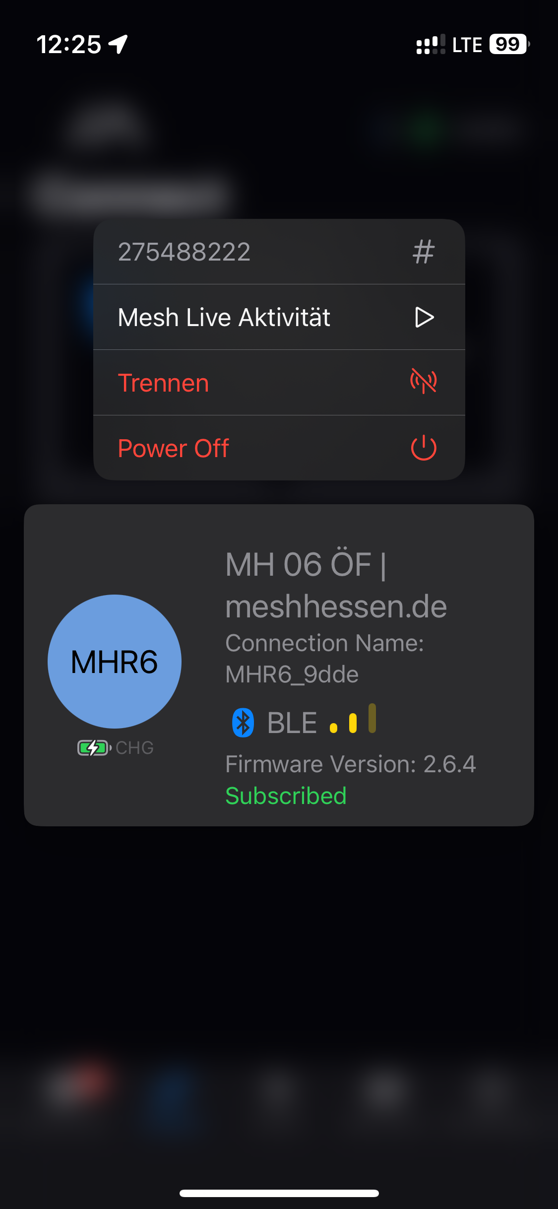 Die Meshtastic Node auf dem Herzberg verbindet sich nun über Bluetooth mit Ihrer App bis schleßlich unten „Subscribed“ in grün erscheint und oben rechts in der Ecke das grüne Symbol für eine erfolgreiche Koppelung mit „MHR6“ erscheint.