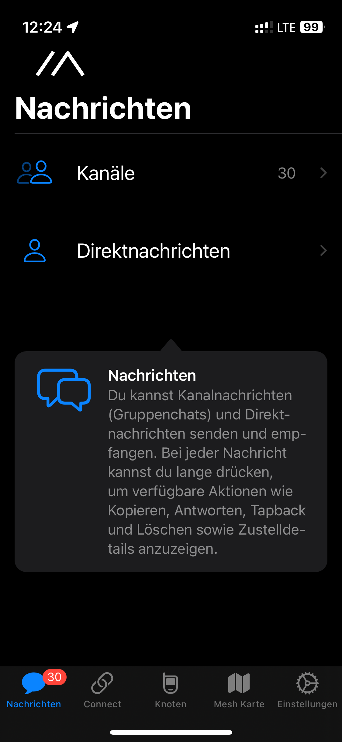 Unter dem Reiter „Nachrichten“ können Sie nun die verfügbaren Chat-Kanäle einsehen, bzw. Direktnachrichten an empfangbare Nodes aus der Nodeliste senden, die im Reiter „Knoten“ angezeigt werden.
