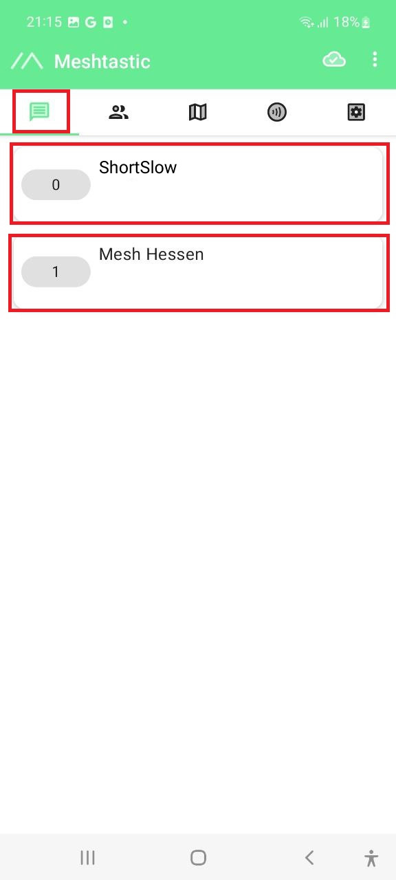 Dort finden Sie die zwei Kanäle (Chats) in die Sie Kurznachrichten versenden können. Dies wäre zum einem der Meshtastic „ShortSlow“ Kanal und der „Mesh Hessen“ Kanal. Wählen sie einen der beiden Kanäle aus. Auf dem Mesh Hessen Kanal ist natürlich am meisten los und die Chance ist am größten, jemanden zu erreichen.